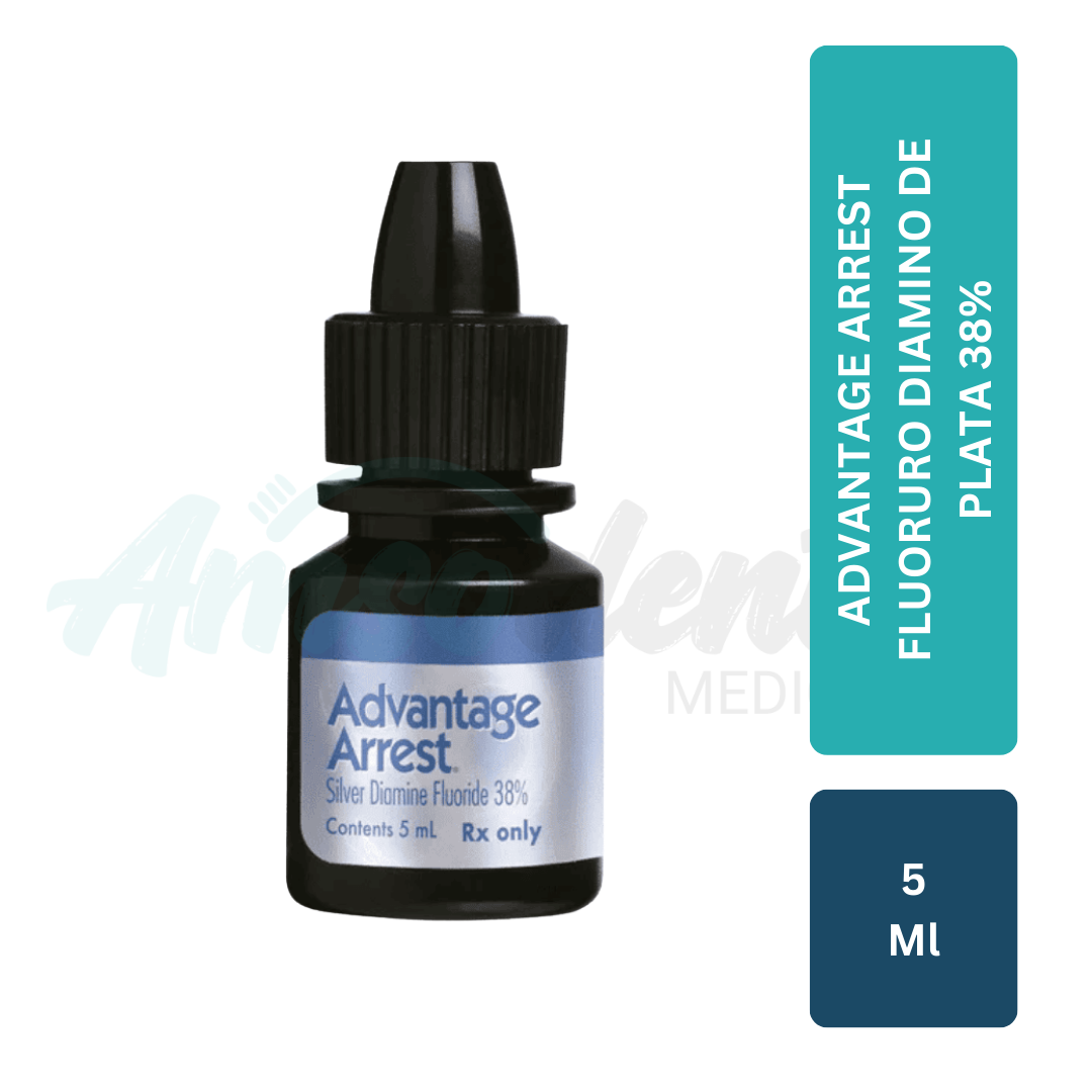 Advantage Arrest Fluoruro Diamino de Plata 38% es una solución tópica de uso odontológico indicada para el arresto de lesiones de caries activas, especialmente en pacientes pediátricos, geriátricos o con manejo clínico limitado, donde se requiere un tratamiento no invasivo, rápido y altamente efectivo.