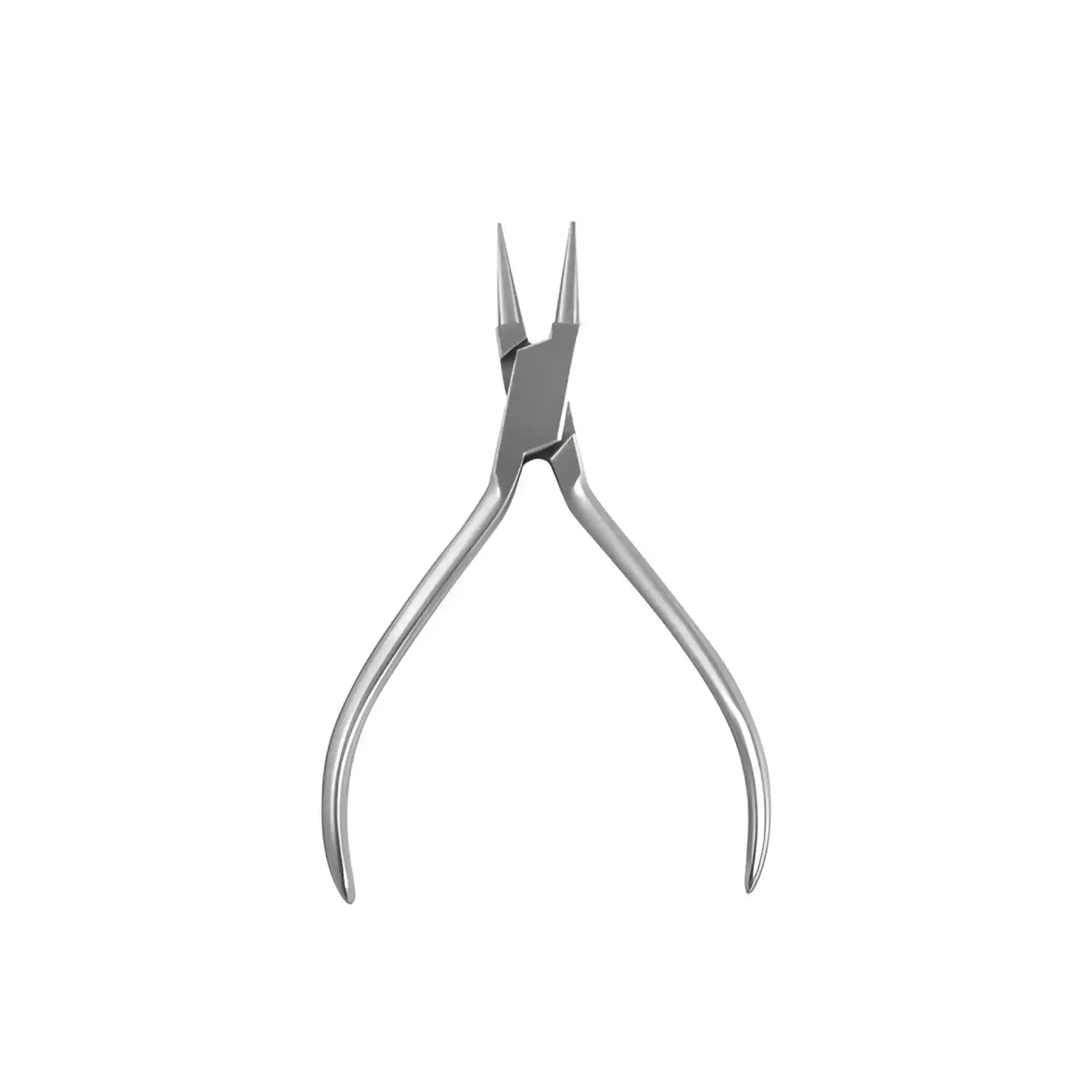 Alicate dentario con punta redonda y punta plana en tamaño largo, diseñado para sujetar, doblar o manipular componentes en procedimientos odontológicos y ortodónticos. Ofrece precisión y alcance en espacios amplios.