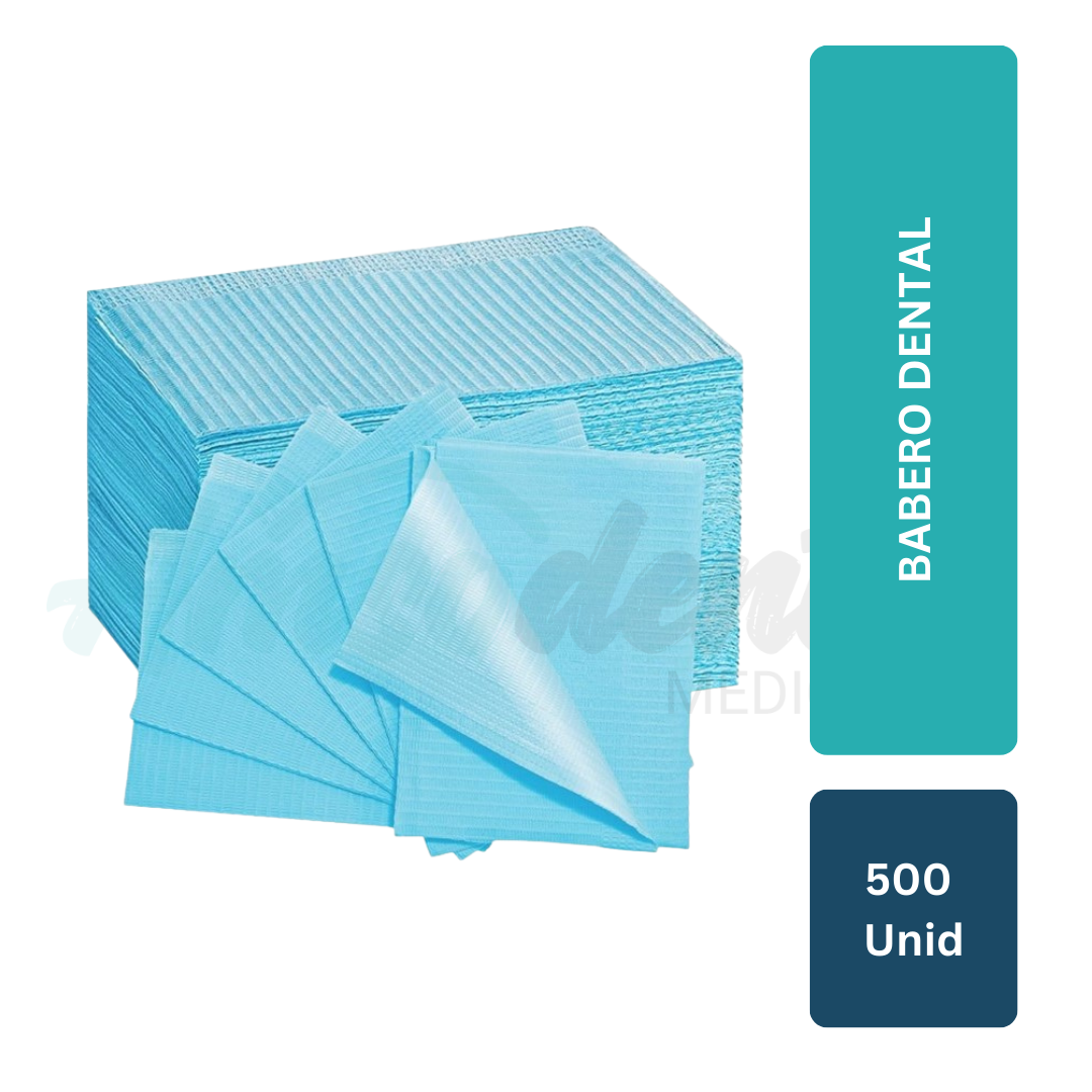 Babero dental desechable de alta absorción. Protege eficazmente la ropa del paciente y cumple protocolos de higiene. Pack de 500 unidades, ideal para clínicas y consultorios odontológicos.