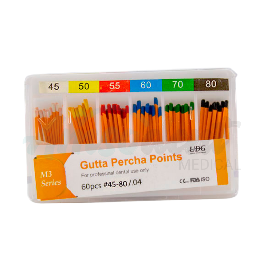 Fabricados con gutapercha de alta calidad, estos conos presentan dimensiones estandarizadas, consistencia uniforme y una flexibilidad óptima, lo que permite una inserción precisa y una adaptación adecuada a las paredes del conducto radicular. Su diseño favorece la obturación tridimensional cuando se utilizan en combinación con selladores endodónticos.