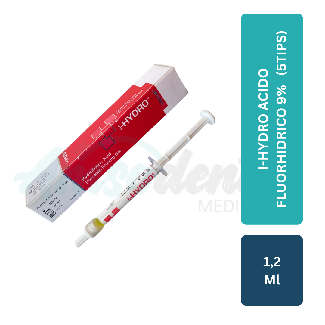 I-HYDRO Ácido Fluorhídrico 9% – Jeringa 1,2 ml + 5 tips, grabador cerámico en gel para una adhesión segura y eficaz en restauraciones estéticas. Uso profesional.