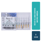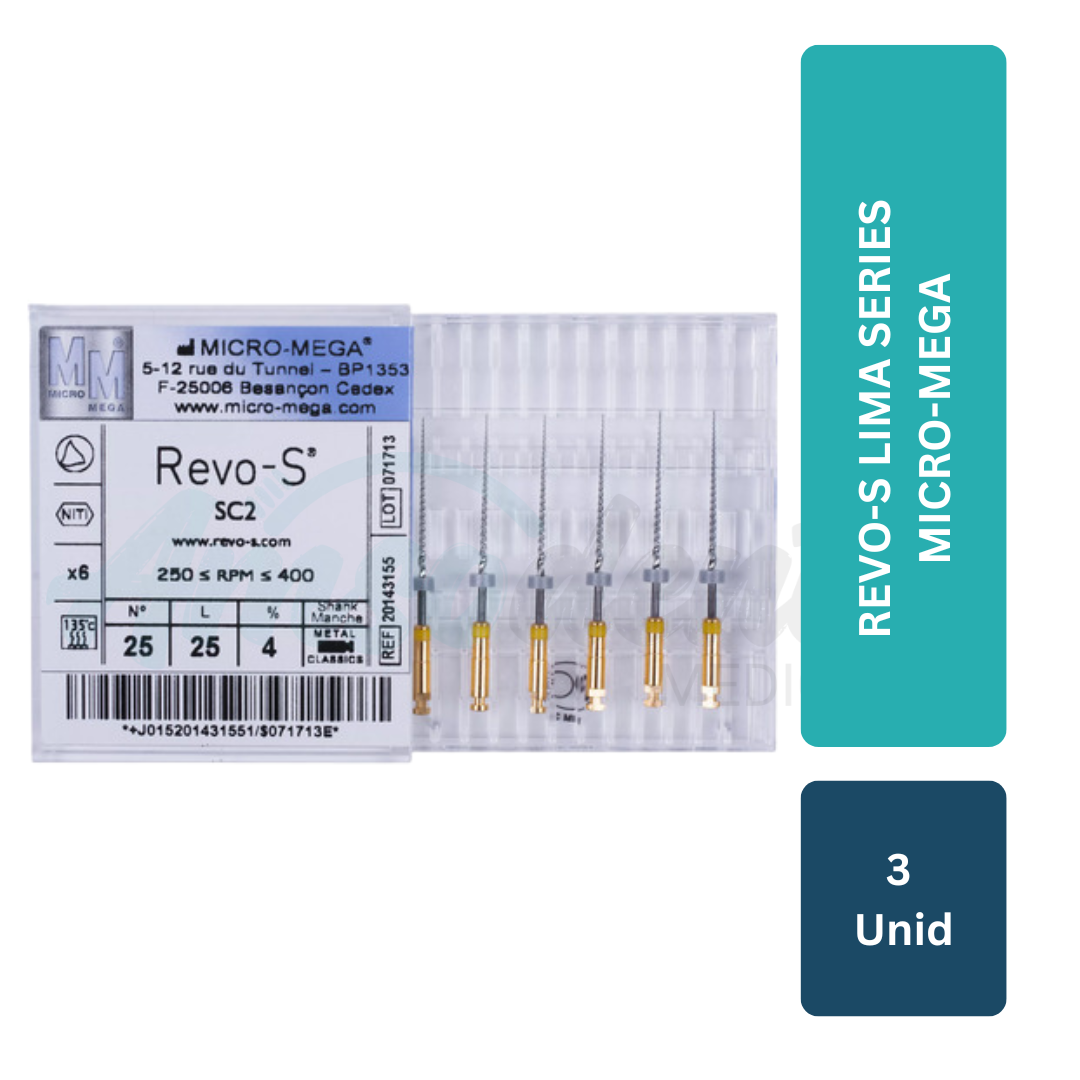 Revo-S Lima Series es un sistema de limas endodónticas rotatorias desarrollado para optimizar la instrumentación del conducto radicular mediante una secuencia eficiente y controlada. Su diseño asimétrico innovador reduce el contacto con las paredes del conducto, mejorando la eliminación de detritos y disminuyendo el riesgo de atascamiento o fatiga del instrumento.