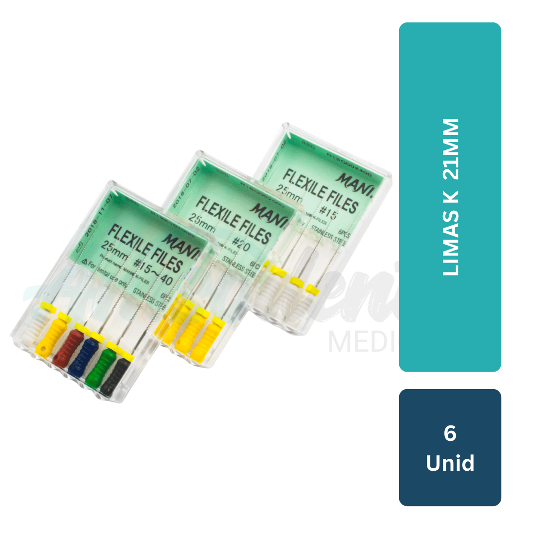 Limas K 21 mm en caja de 6 unidades, indicadas para instrumentación manual endodóntica. Ofrecen excelente control táctil, precisión y maniobrabilidad en conductos cortos y de acceso limitado.